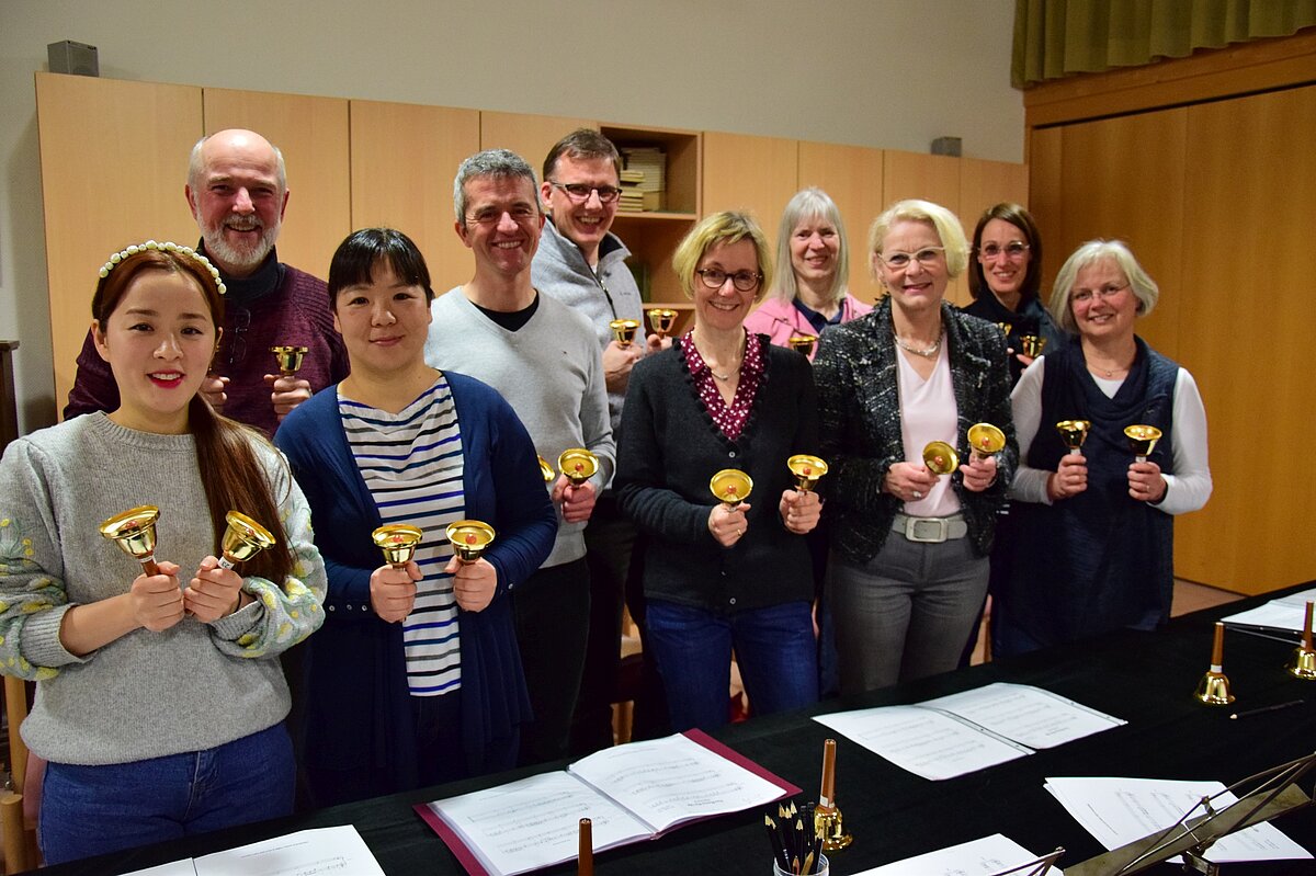 Notenkenntnisse sind nicht unbedingt nötig, Rhythmusgefühl schon, Feude an Musik sowieso. Der Handglockenchor unter Leitung von Hoonhan Lee spielt Klassik, Modernes und Kirchenlieder.